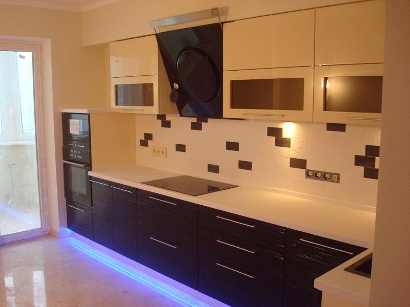 Двухцветная угловая кухня с встроенной бытовой техникой.