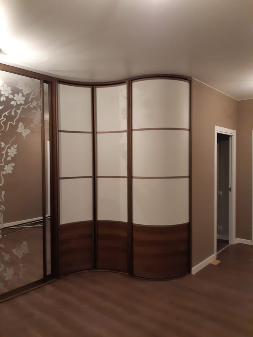 Корпусный угловой шкаф купе с радиусными фасадами.