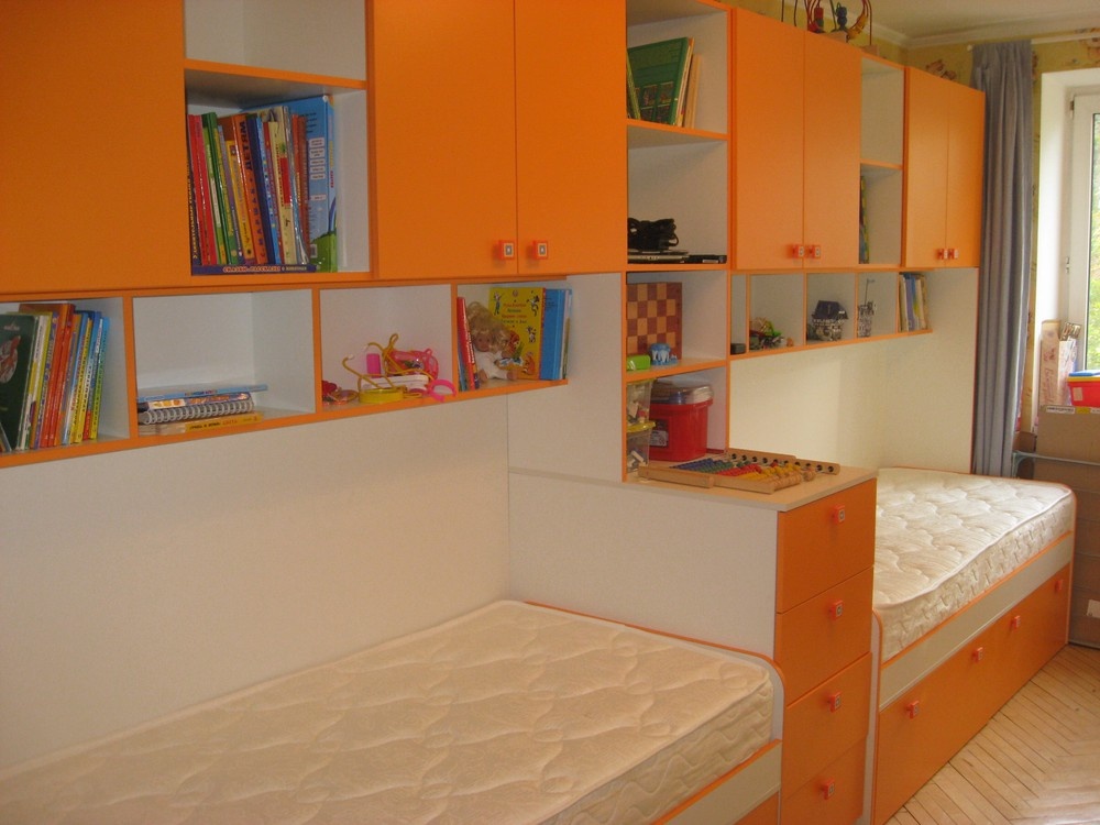 Комплект яркой мебели с двумя кроватями.