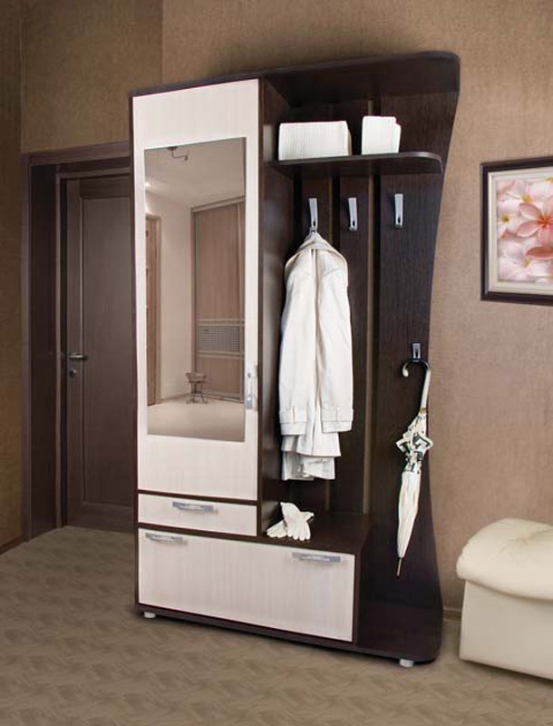 Мини-прихожая в распашной дверью, откидной секцией для обуви и открытыми элементами.