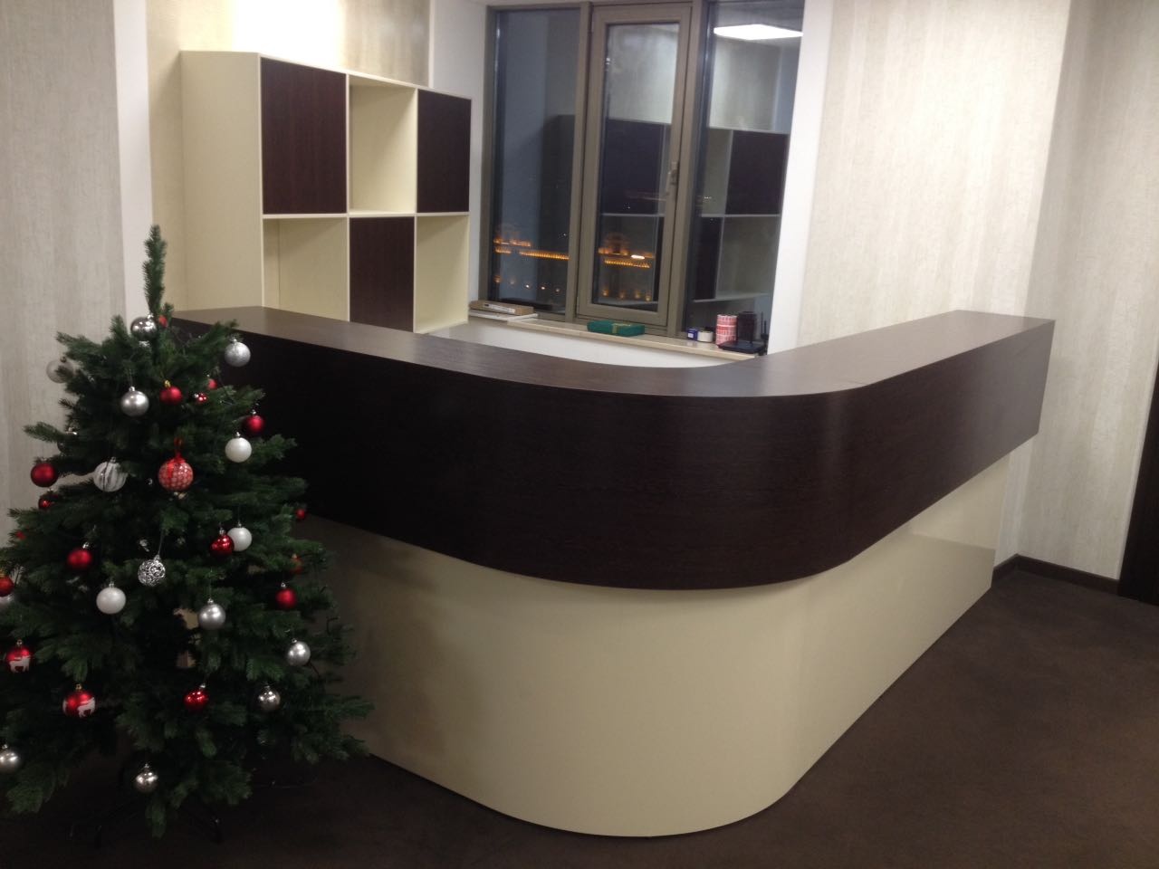Главная > Каталог > Ресепшн > 13. Угловая бежево-коричневая стойка со стеллажом