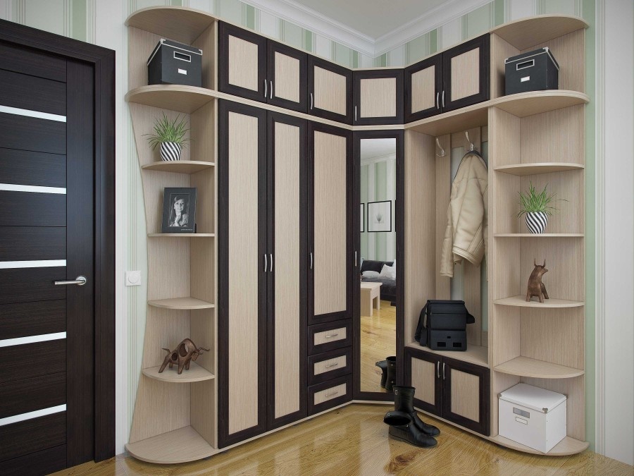Угловая прихожая с рамочными распашными дверьми и открытыми радиусными полками.