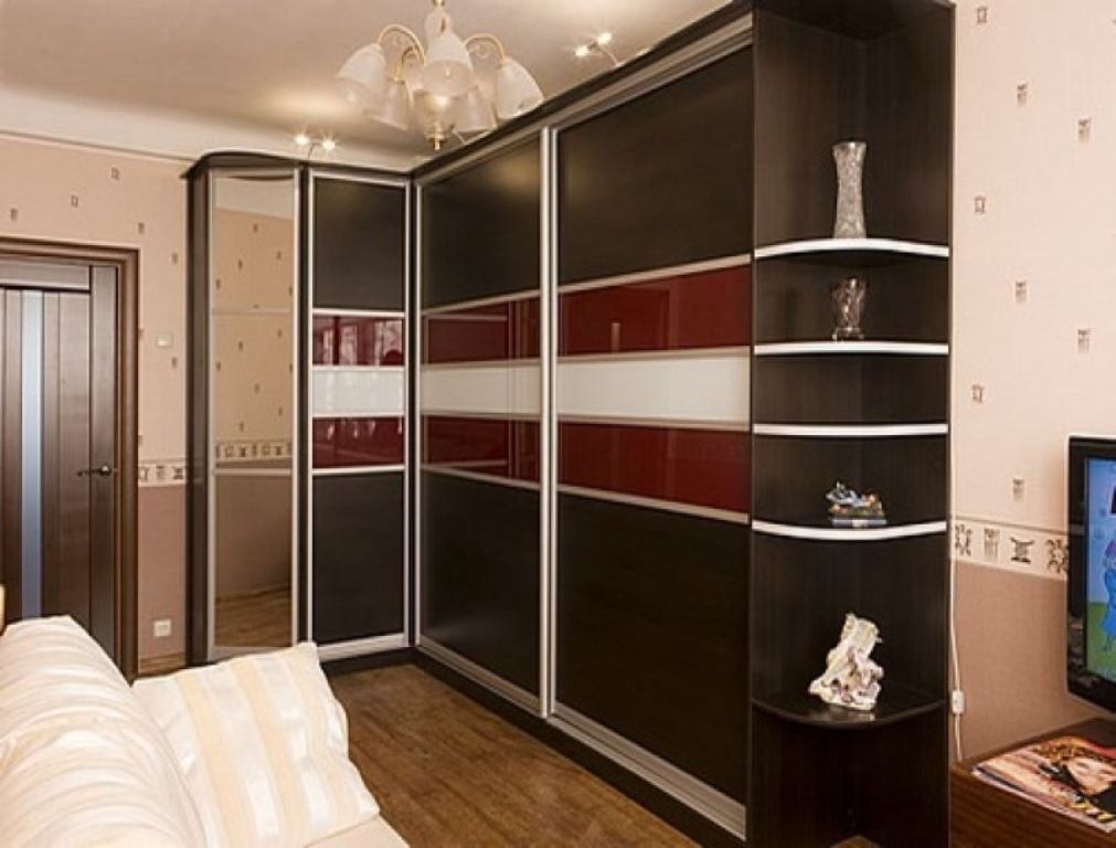 Корпусный угловой шкаф-купе в гостиной.