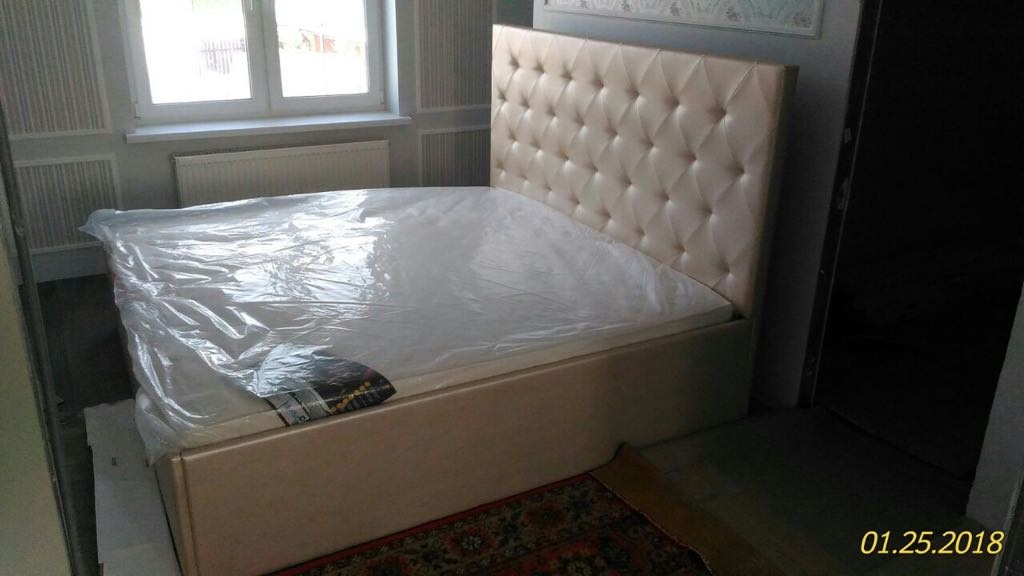 Главная > Каталог > Спальни на заказ > 23. Установка бежевой двуспальной кровати