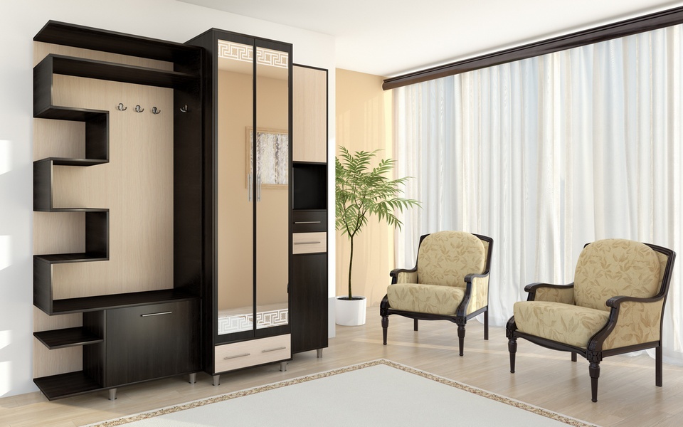 Оригинальная компактная прихожая на заказ с открытой секцией для одежды и зеркалом.